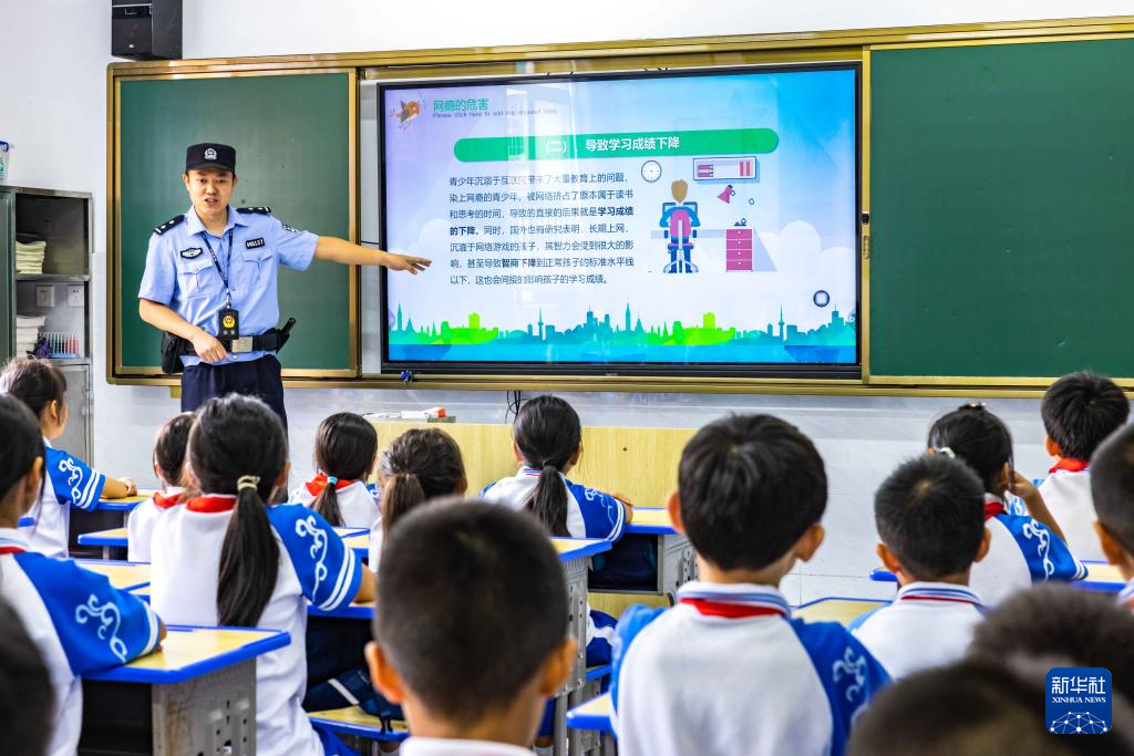 9月11日,贵州省安顺市公安局西秀分局民警在安顺市第七小学为学生讲解不良上网习惯的危害。