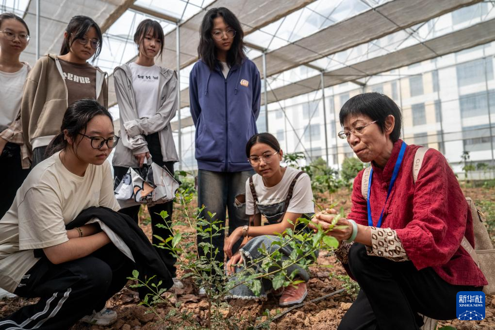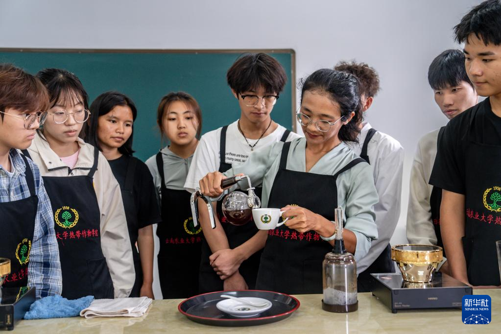 9月10日,云南农业大学热带作物学院教师陈云兰(右三)在给咖啡专业的学生上咖啡认知课。