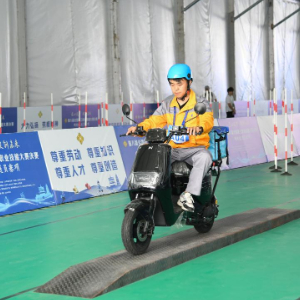 9月11日,选手在位于西安国际会展中心的比赛场地参加网约配送员工种比赛。