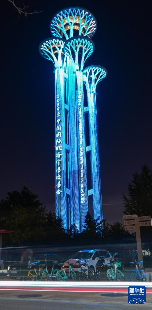 2024年中国国际服务贸易交易会期间,北京的奥林匹克中心区、大望京建筑组群、CBD等核心地标上演楼体灯光秀,以绚丽的光影庆祝服贸会召开。