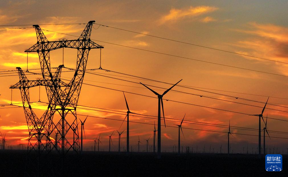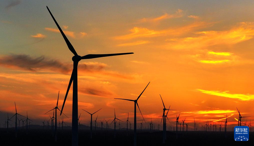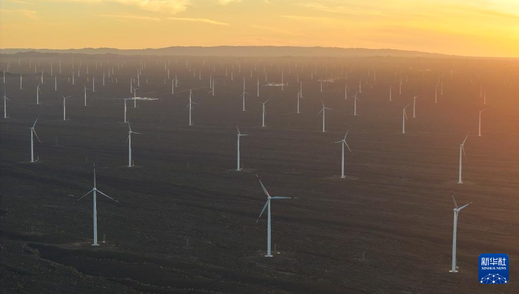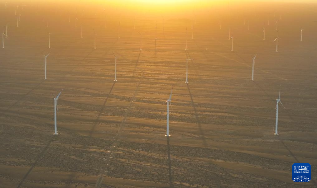 夕阳映照下的新疆哈密市三塘湖风电场一角(9月10日摄,无人机照片)。
