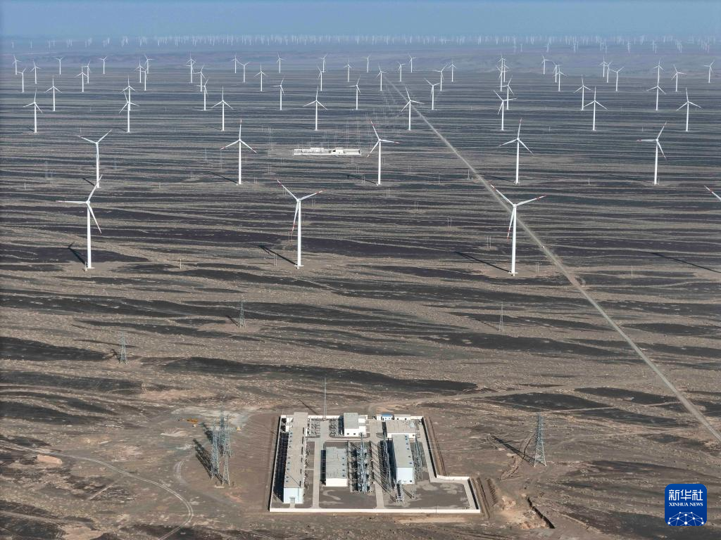 这是9月7日在新疆哈密市三塘湖风电场拍摄的一座风电汇集站与风机(无人机照片)。