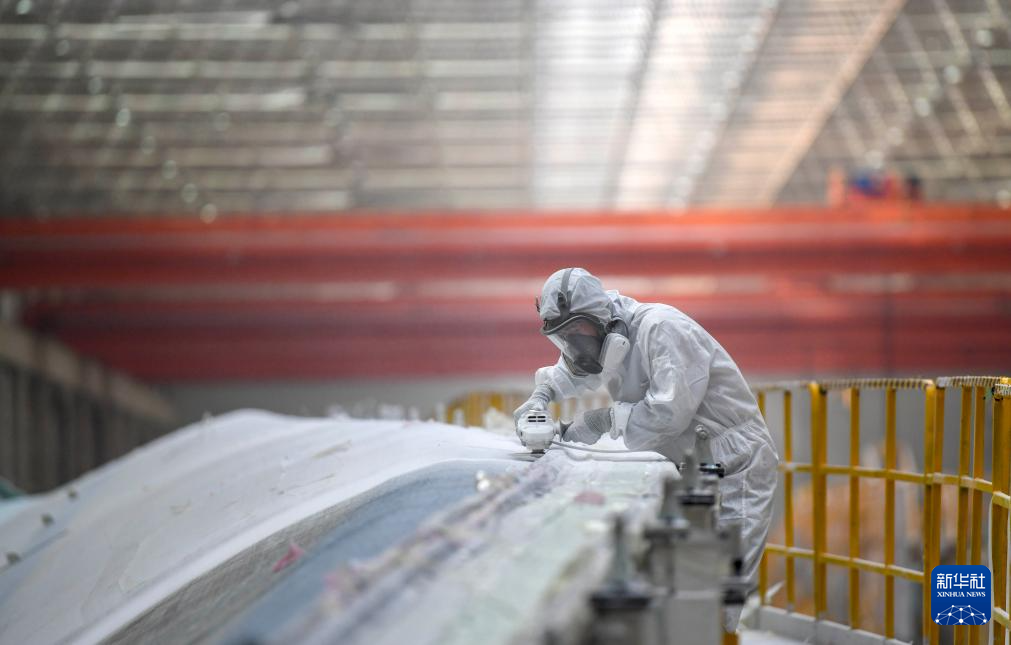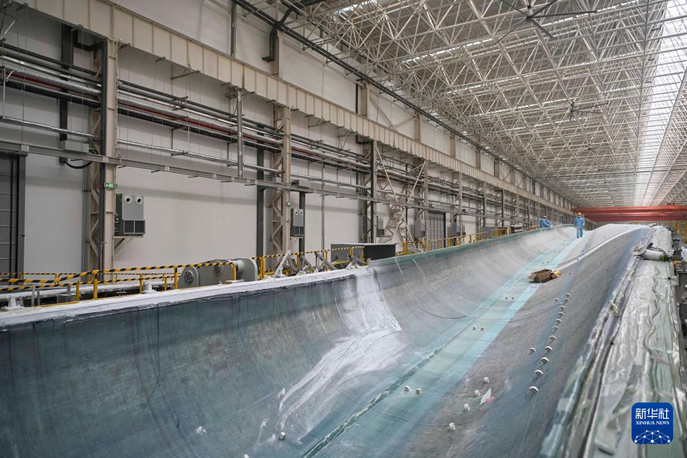 在新疆哈密市巴里坤哈萨克自治县大河新兴产业园,工人在车间打磨风机叶片模具(9月10日摄)。