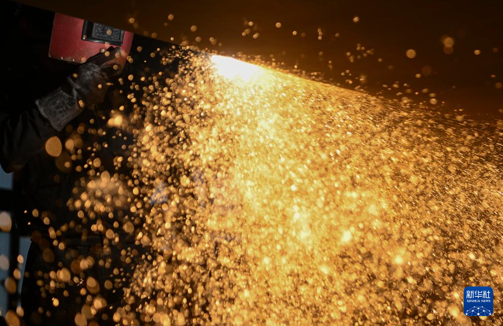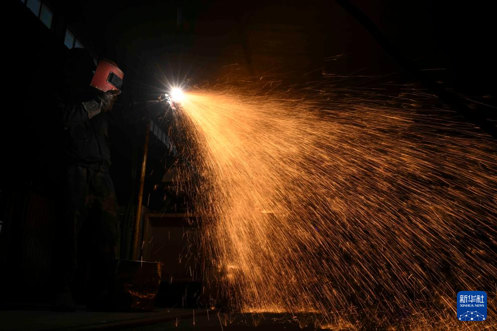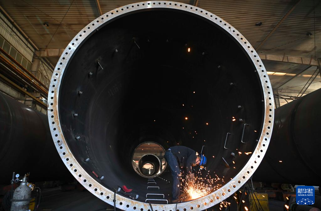 9月10日,在新疆哈密市高新技术产业开发区的一家风电装备制造企业,工人进行塔筒焊接作业。