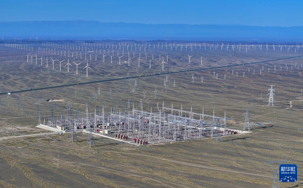 这是9月10日在新疆哈密市三塘湖风电场拍摄的一座750千伏变电站、风机(无人机照片)。