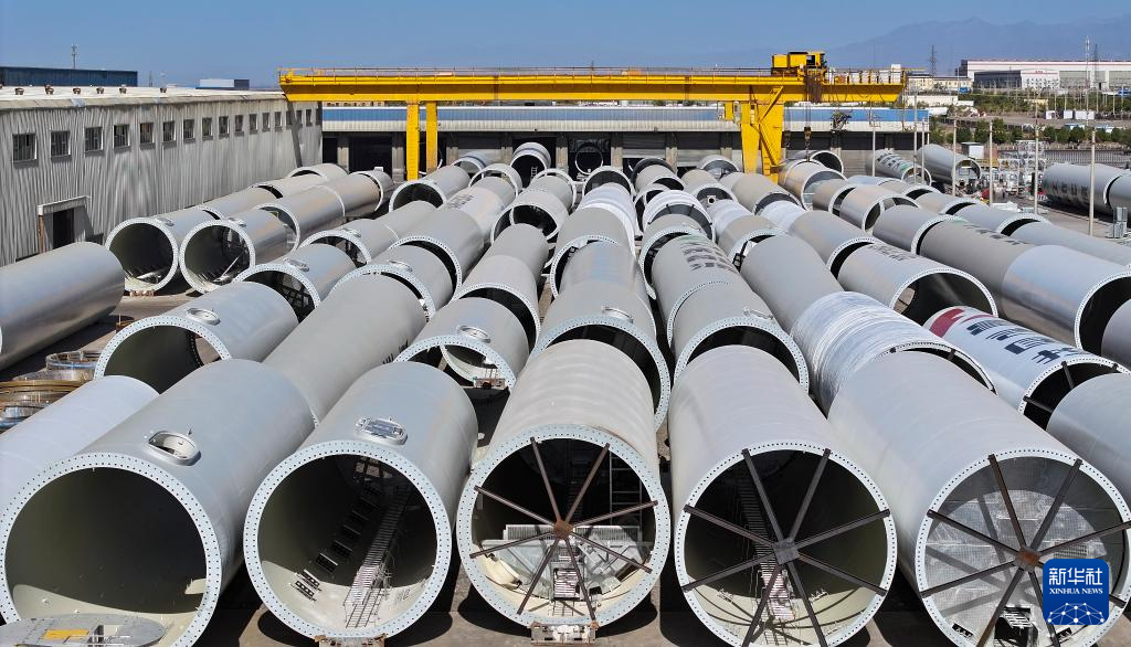 这是9月10日在新疆哈密市高新技术产业开发区拍摄的一家风电装备制造企业生产的塔筒(无人机照片)。