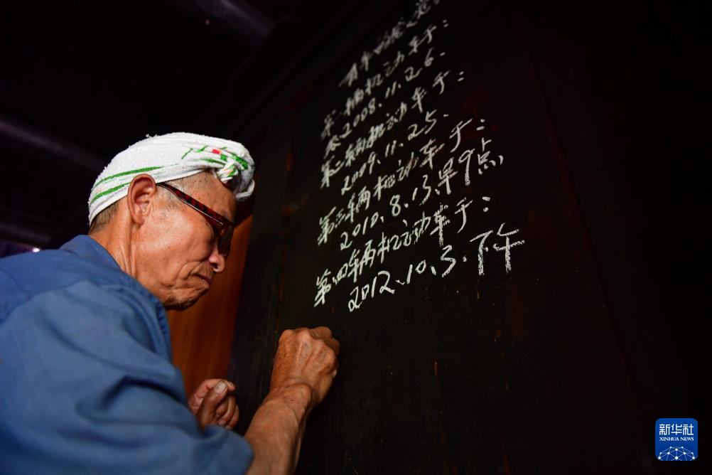 梁安合在墙上记录儿子梁秀前购买机动车的历史(2019年4月19日摄)。