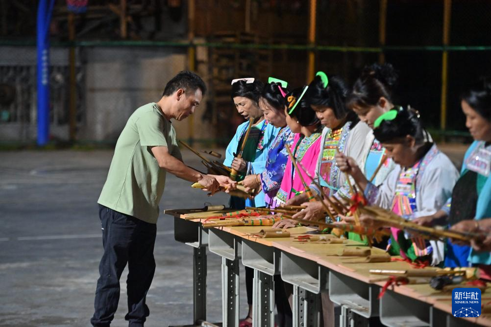 在乌英苗寨妇女夜校,梁安合(右一)指导妇女们练习吹芦笙(2024年9月10日摄)。