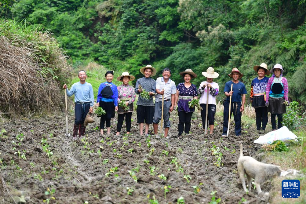 梁安合(左一)、梁秀前(左四)和村民们在红薯种植基地合影(2019年5月24日摄)。