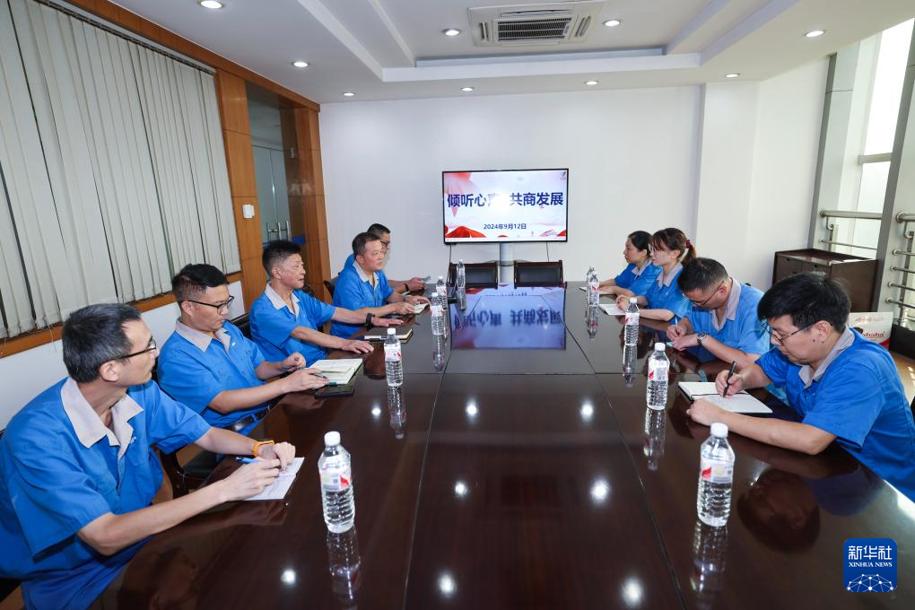 9月12日,嘉兴市南湖区的人大代表曹继华(左三)、王洪祥(左四)在企业员工座谈中听取职工意见,并现场解答问题。