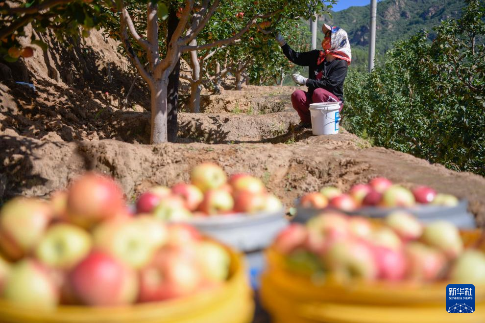 9月12日,农民在围场县四道沟乡庙宫村一处果园采收金红苹果。