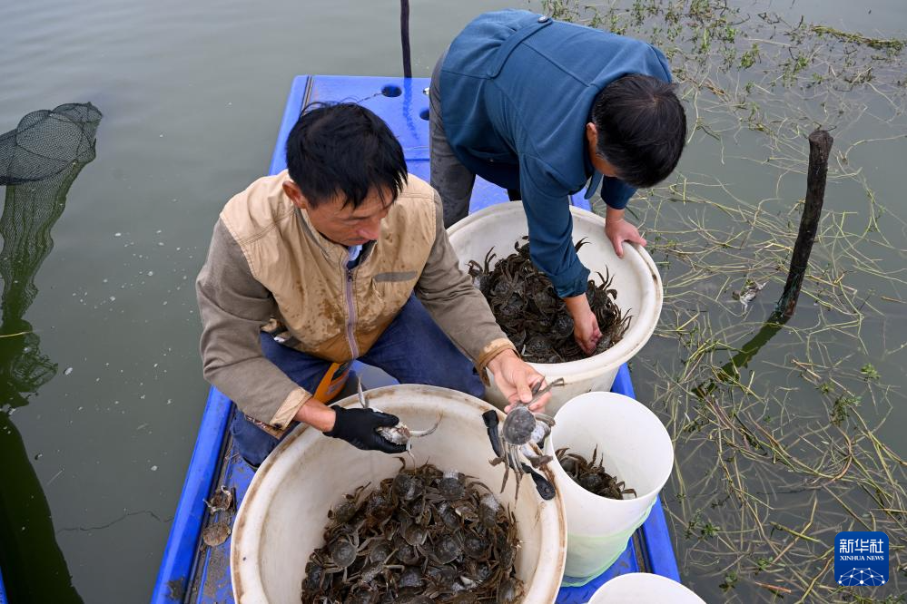 临近中秋节,安徽省蚌埠市五河县的蟹农们忙着捕捞螃蟹,供应节日市场。近年来,五河县依托当地优质水域,大力发展螃蟹养殖业。促进农民增收致富。目前,五河县螃蟹养殖面积近7万亩。