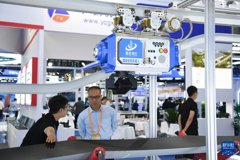 9月13日,观众在展会现场了解一款巡检机器人产品。