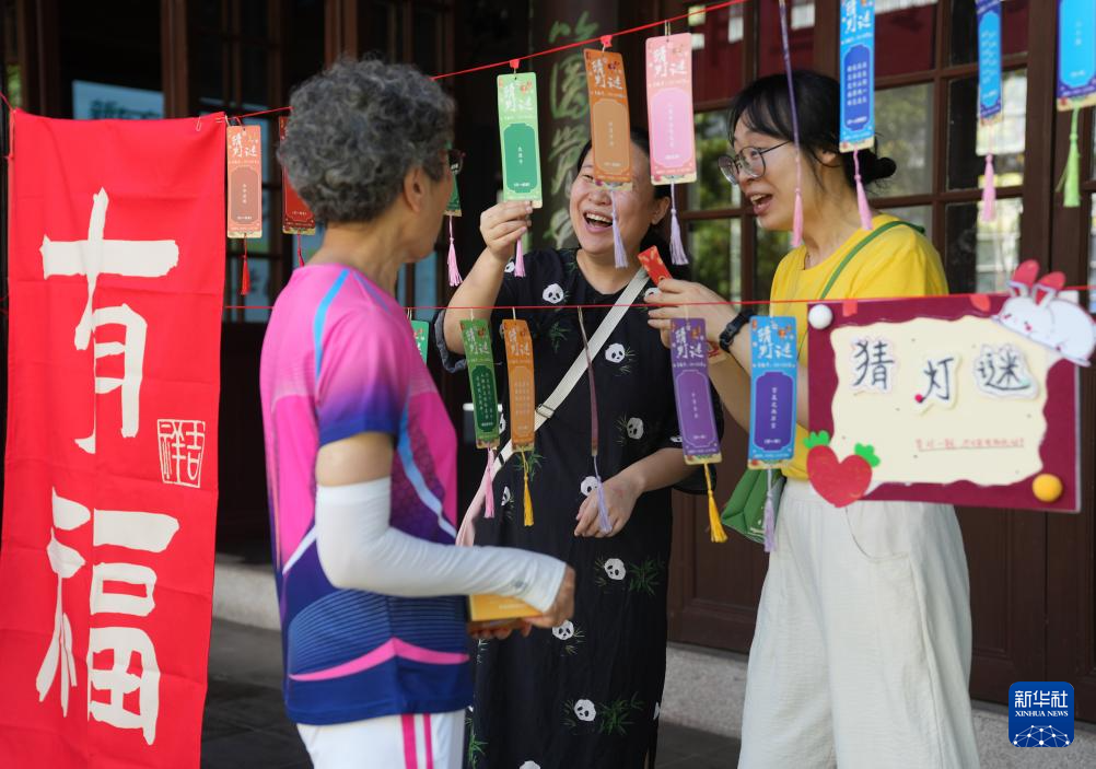 9月13日,杭州市西湖区北山街道举办的中秋庙会上,社区居民在猜灯谜。
