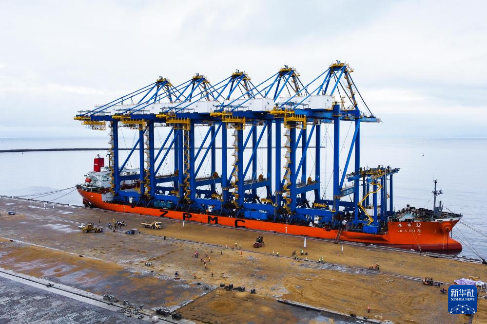 9月12日,一艘来自中国的大型特种运输船运载着数架港口起重机停靠在喀麦隆克里比深水港二期码头(无人机照片)。