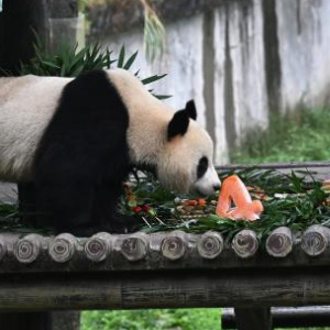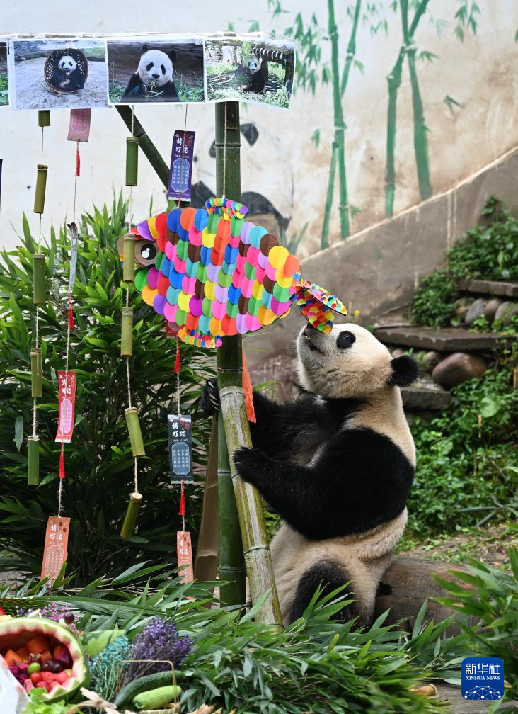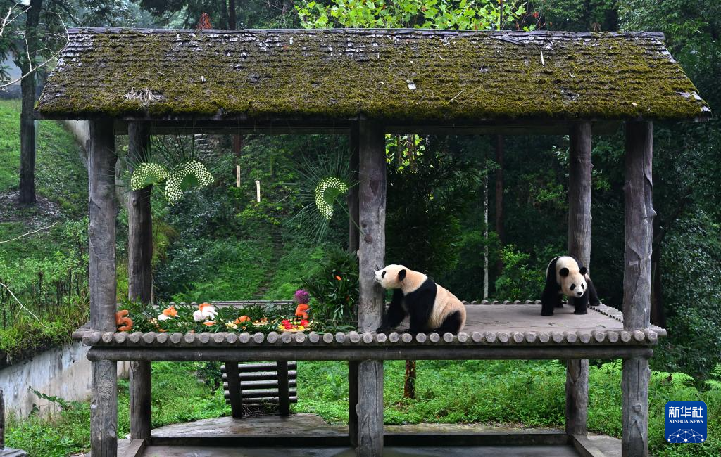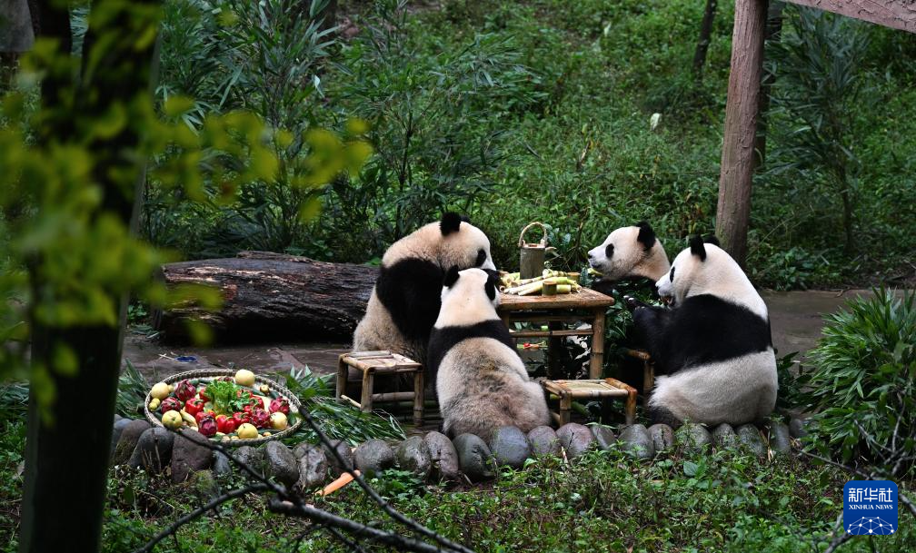 当日,中国大熊猫保护研究中心雅安基地为近期过生日的熊猫准备了一场集体生日会,饲养员们结合中秋节主题,精心准备了月饼窝窝头、水果拼盘、竹笋蛋糕及茶具茶桌等。