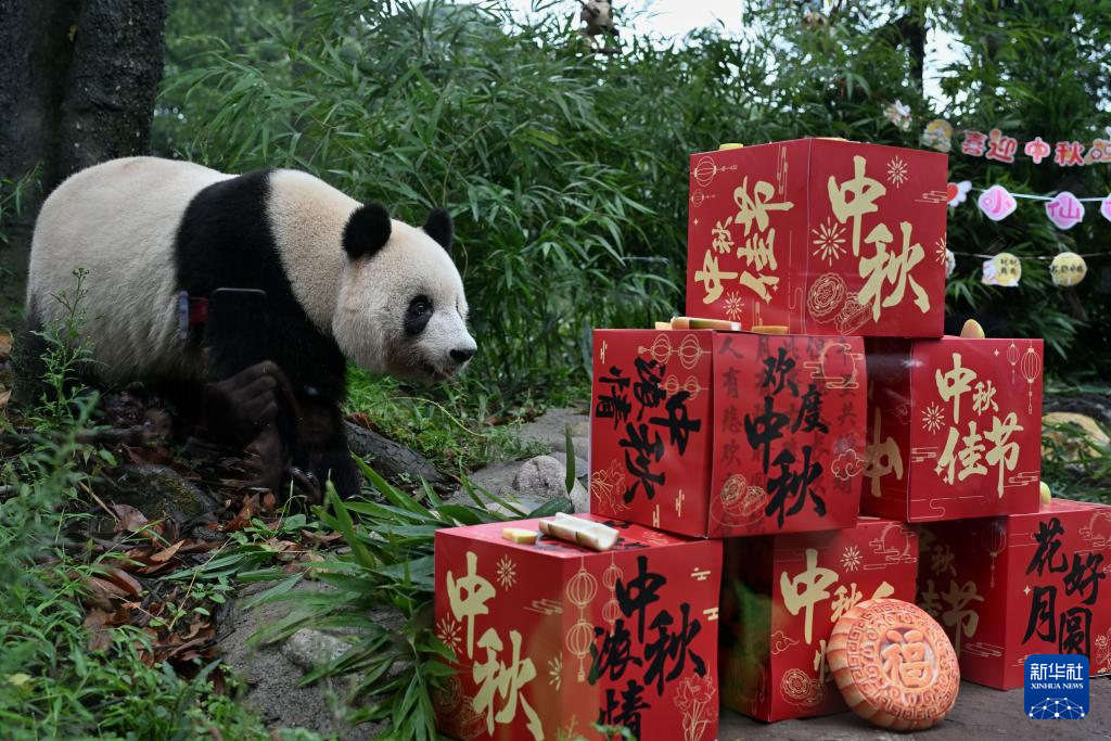 9月13日,大熊猫“香香”走向中秋礼盒。