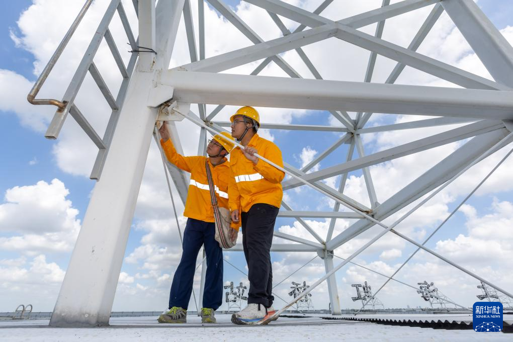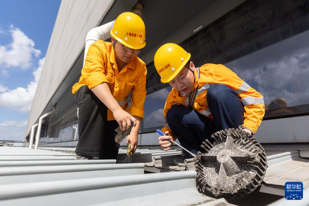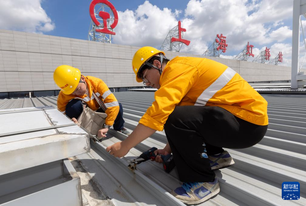 9月13日,房建巡检工在上海虹桥火车站屋顶上作业。