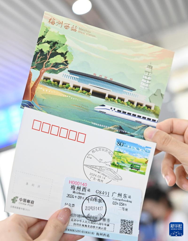 9月14日,一名旅客在梅州西站手持G8491次列车车票和纪念龙龙高铁梅龙段开通运营的邮政明信片。