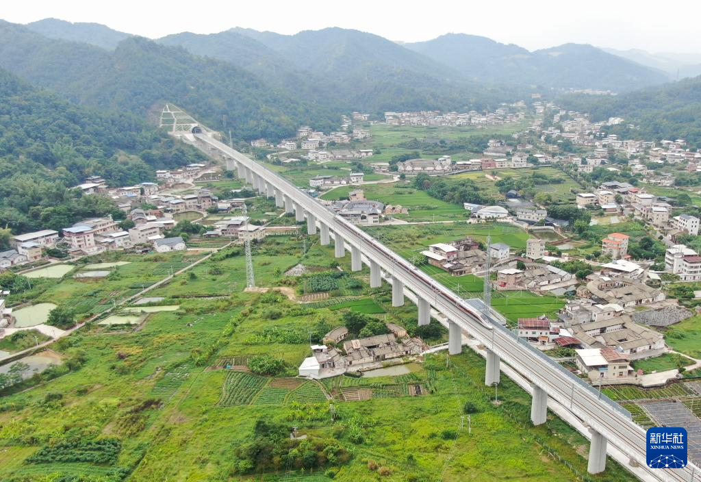 这是9月13日,复兴号试验列车行驶在龙龙高铁梅龙段叶屋特大桥上(无人机照片)。