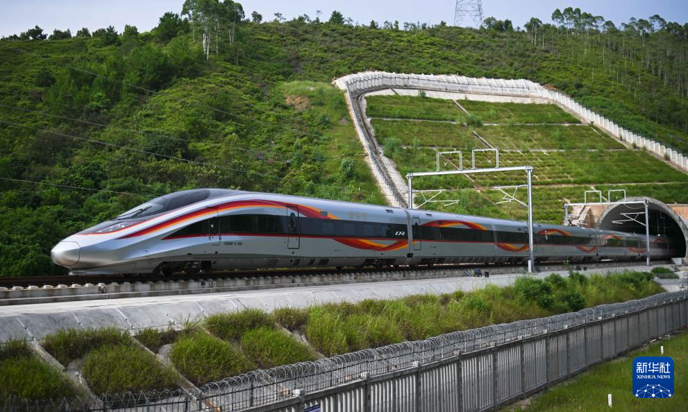 这是9月13日,复兴号试验列车驶出龙龙高铁梅龙段毛公寨隧道。
