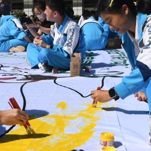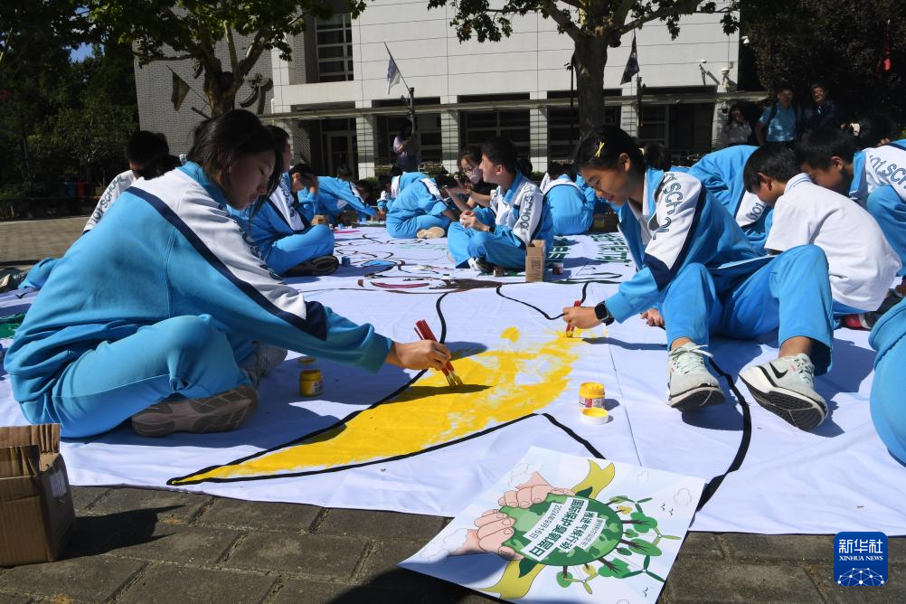 9月14日,北京一零一中学学生绘制保护臭氧层主题宣传画。