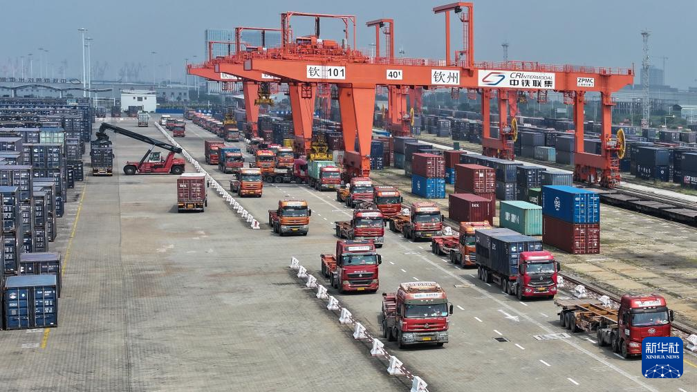 9月14日,在钦州铁路集装箱中心站,货车在排队转运集装箱(无人机照片)。