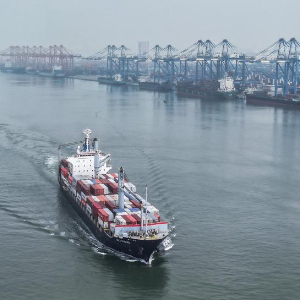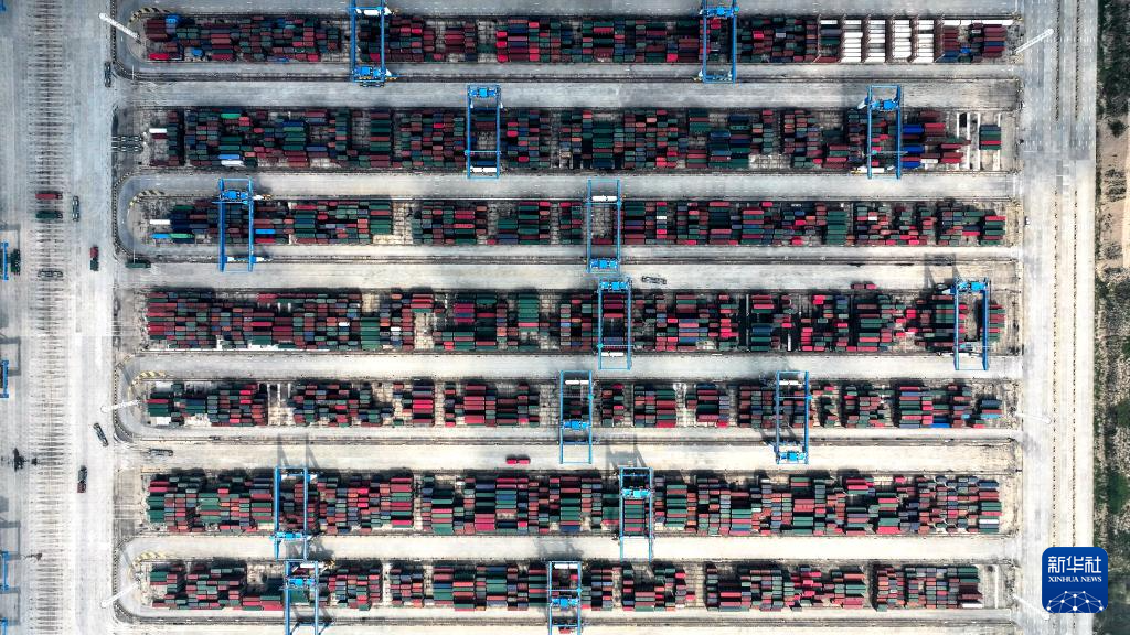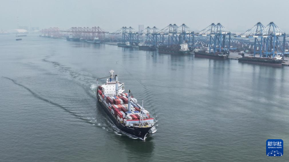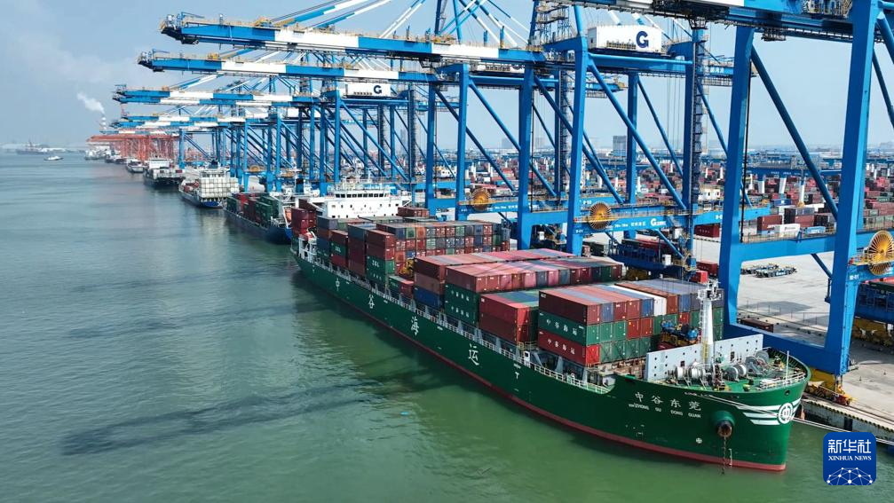 9月14日,一艘满载集装箱的海轮驶离钦州港码头(无人机照片)。
