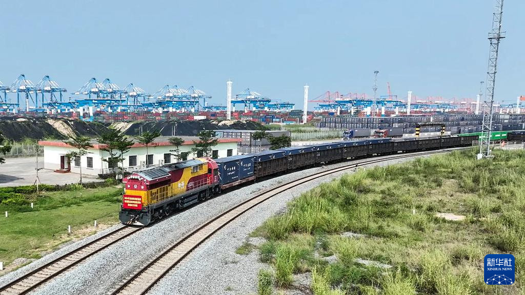 9月14日,满载集装箱的货列驶离钦州港(无人机照片)。