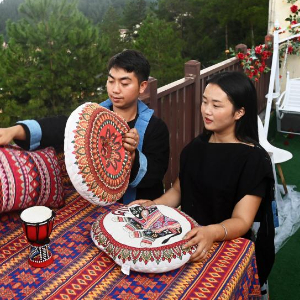 在广西南丹县里湖瑶族乡朵努社区“千家瑶寨·万户瑶乡”易地扶贫搬迁安置点,黎玲(右)和爱人黎明布置拍照场景(9月11日摄)。