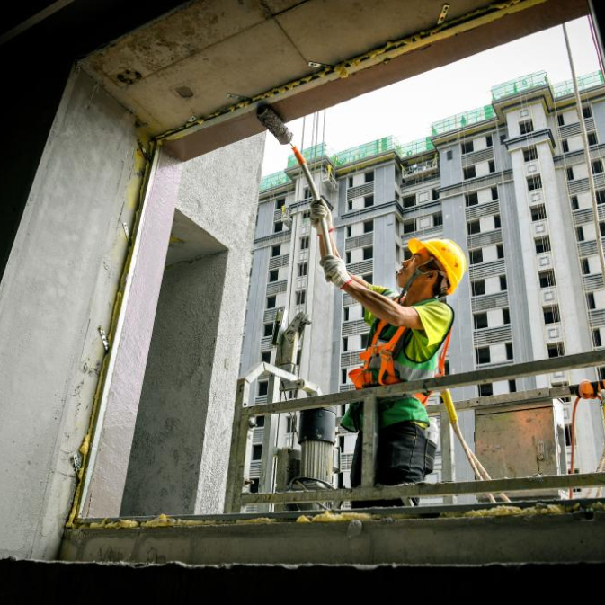 9月15日,中铁十二局工人在雄安新区大河片区建设现场刷防水涂料。
