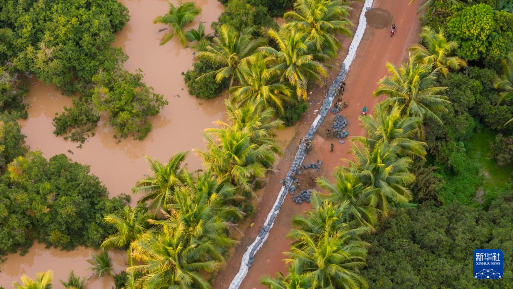 9月14日,在老挝首都万象,老挝官兵用沙袋修建防洪堤(无人机照片)。