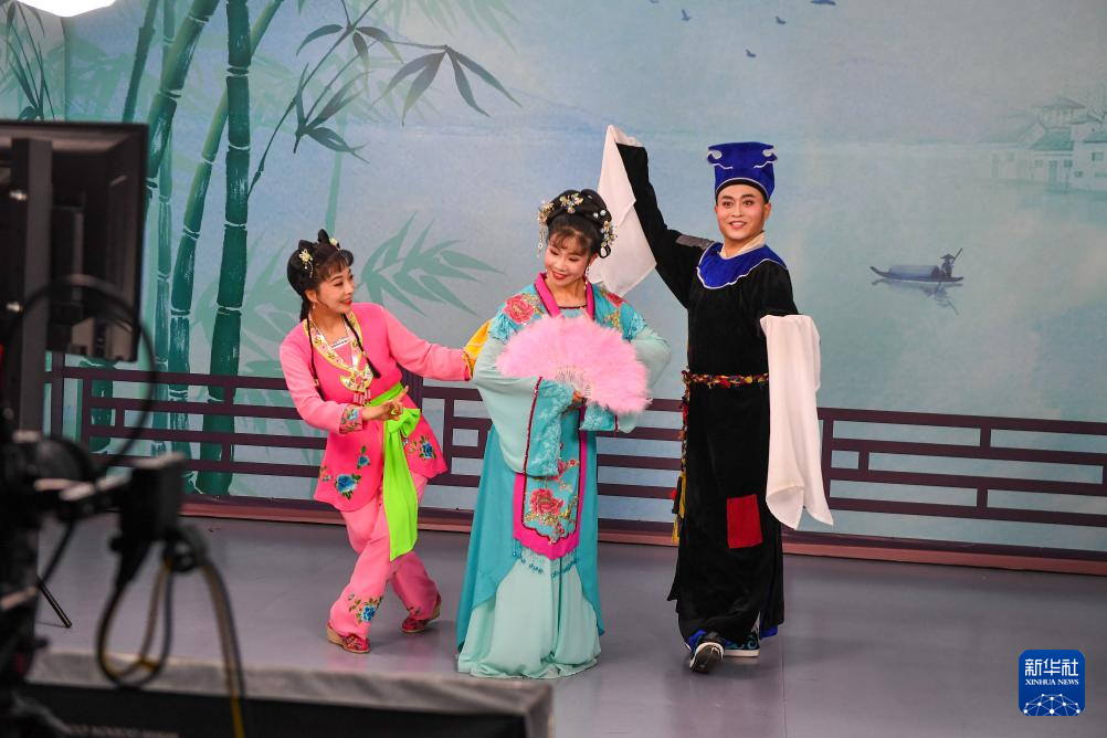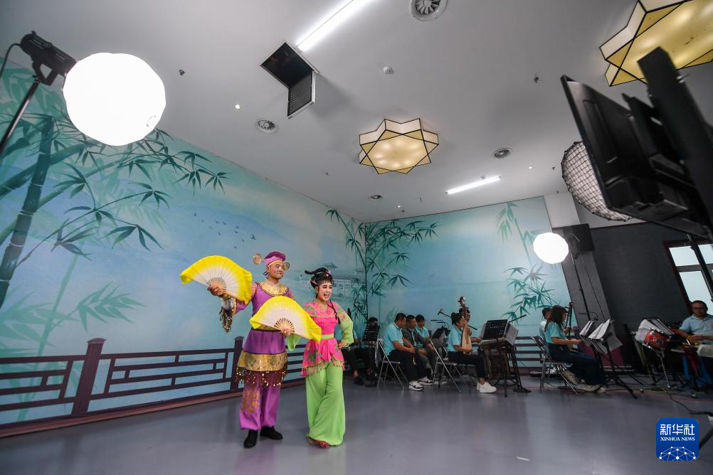 9月4日,在位于吉林省梨树县的吉林省二人转艺术剧院有限责任公司,演员通过网络直播表演二人转。