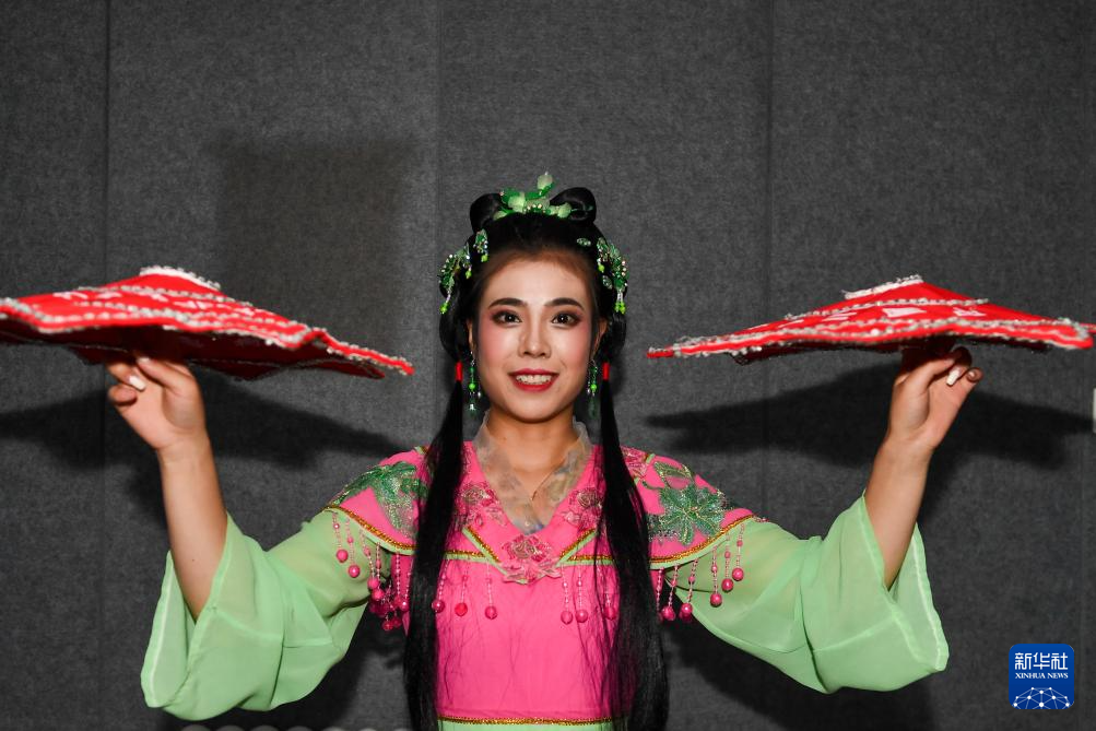 9月10日,在位于吉林省梨树县的吉林省二人转艺术剧院有限责任公司,演员展示转手绢。
