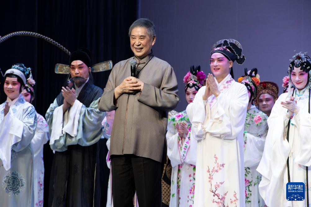 9月14日,作家、青春版昆曲《牡丹亭》总制作人白先勇(前左)在谢幕时同观众交流。