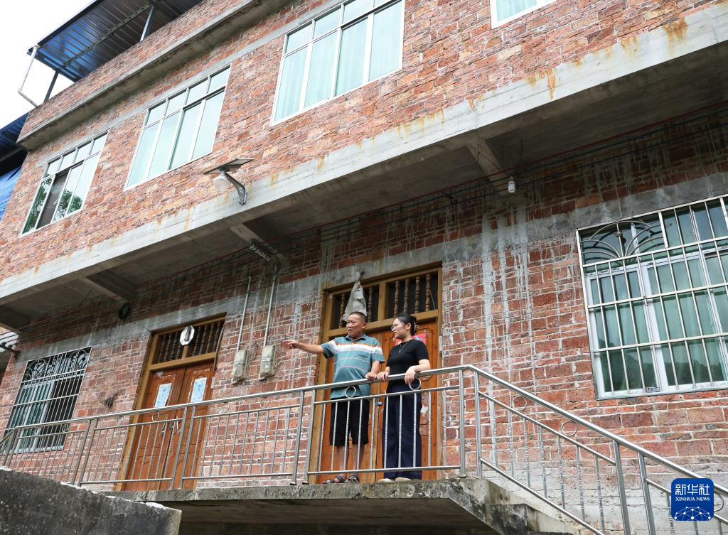 在环江毛南族自治县城西街道耐禾村下善屯,谭献祯(左)在村民韦有送家中了解防止返贫情况(8月29日摄)。