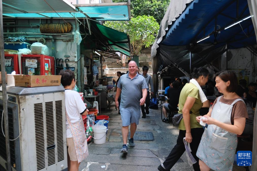 62岁的纽约客戴尔·科斯洛在香港一栋50多年历史的唐楼中接受新华社记者采访(7月5日摄)。
