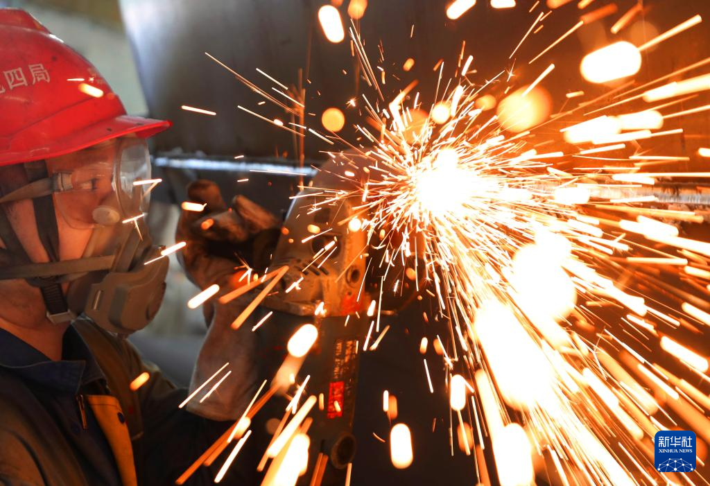 9月16日,在湖南省衡山县高新技术产业开发区,恒岳重钢钢结构工程有限公司员工在进行风电塔筒装备的打磨作业。