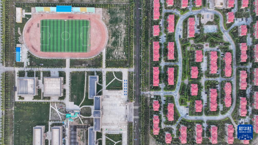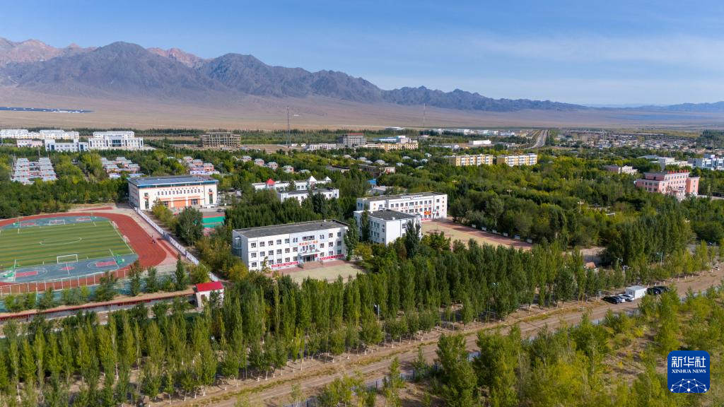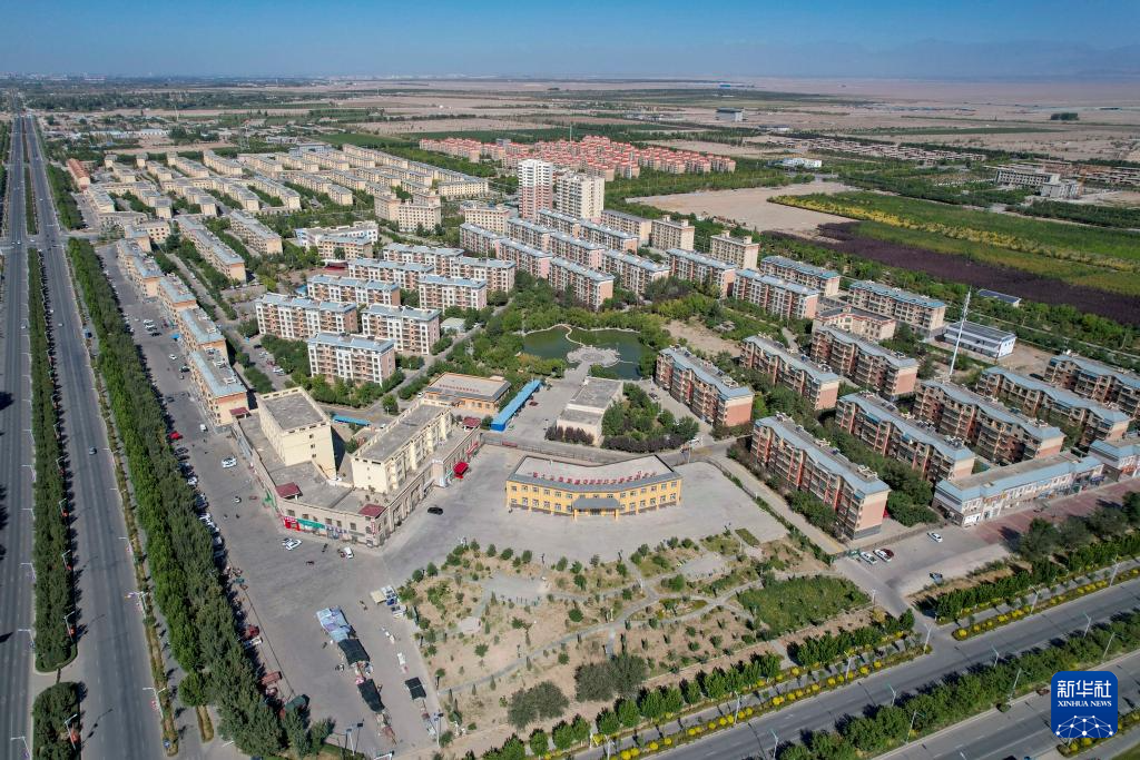 这是2024年9月6日拍摄的新疆生产建设兵团第三师图木舒克市五十四团兴安镇,左侧为当地学校,右侧为幸福小区(无人机照片)。