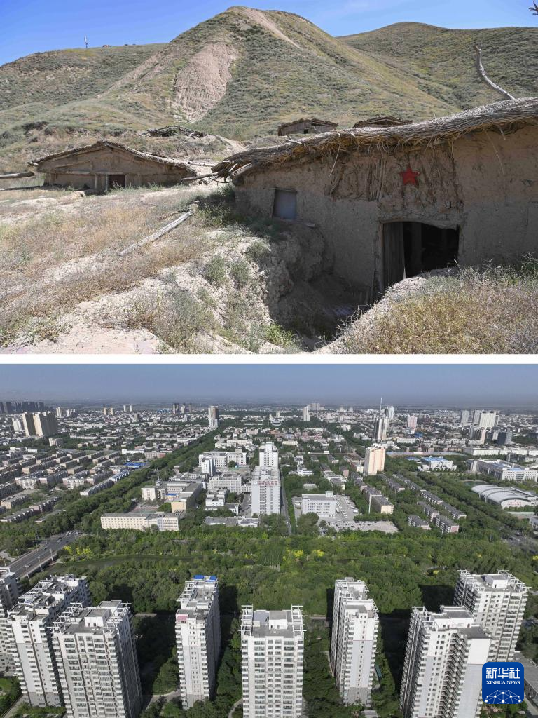 拼版照片:上图为新疆生产建设兵团第八师军垦第一连的地窝子旧址(2024年5月15日摄);下图为新疆生产建设兵团第八师石河子市城区(2024年5月15日摄,无人机照片)。