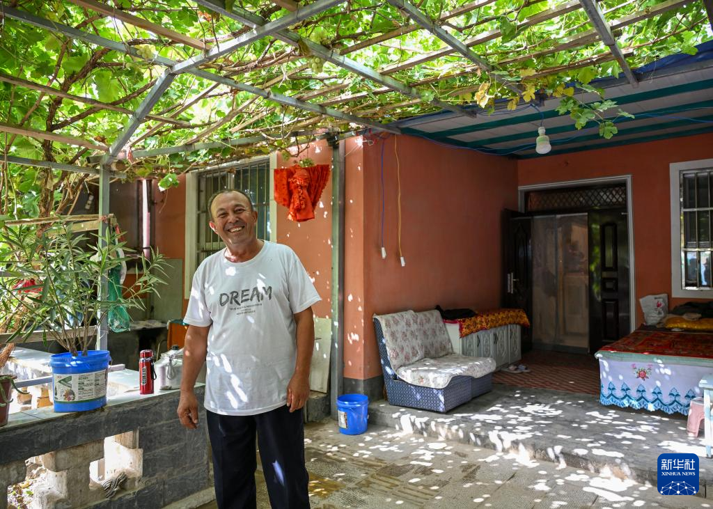2024年9月6日,在新疆生产建设兵团第三师图木舒克市四十五团前海镇,居民吐孙·玉素甫在家门口。他2022年4月搬进由政府补贴建成的新家,用上了天然气和壁挂炉。
