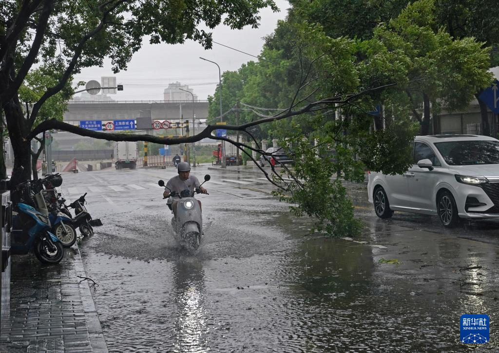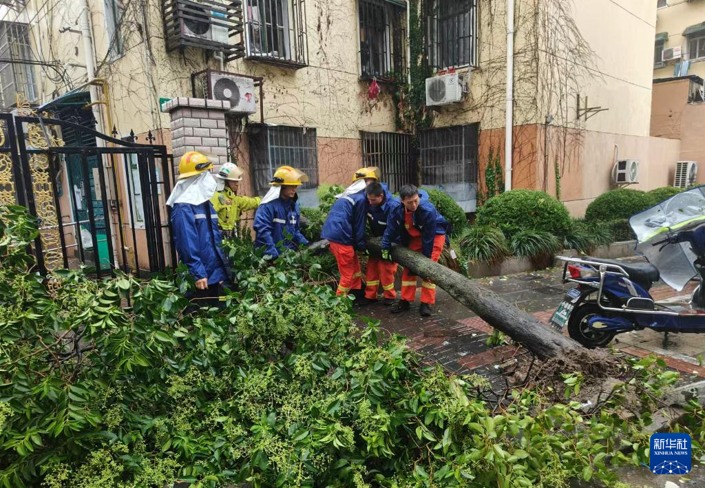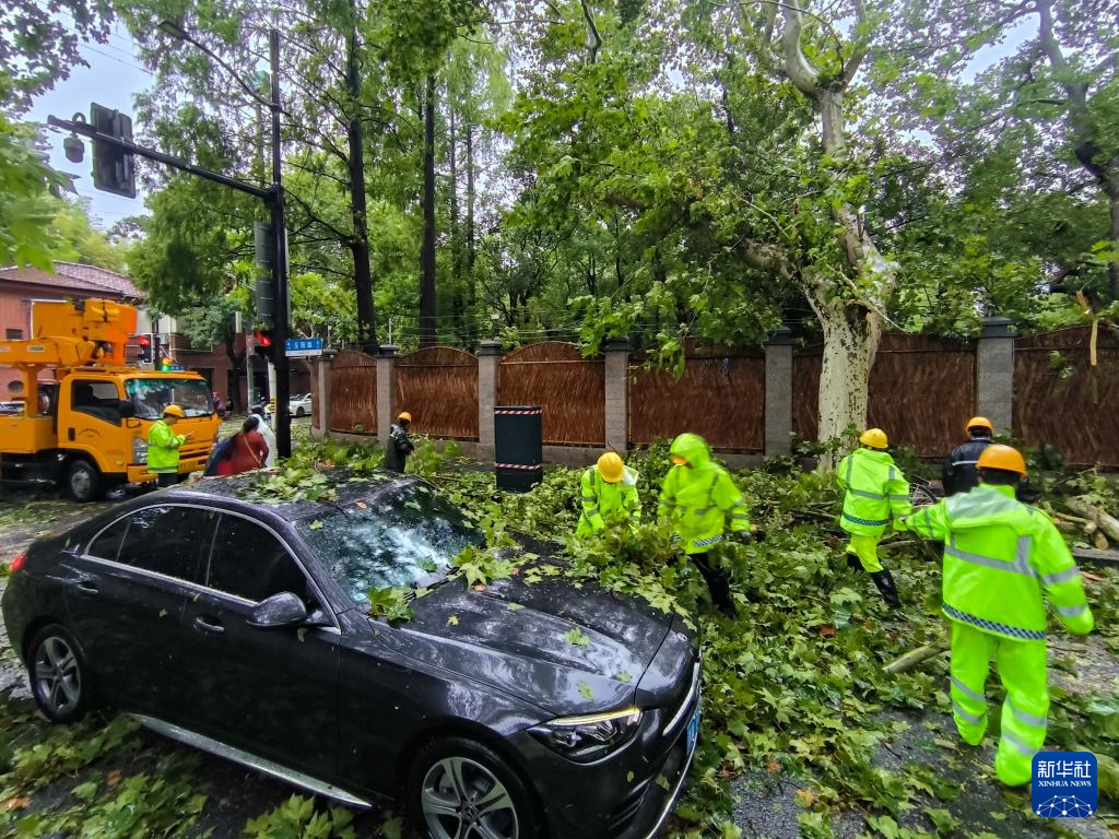 9月16日,上海长宁消防救援支队消防员在移除被风吹倒的树木。