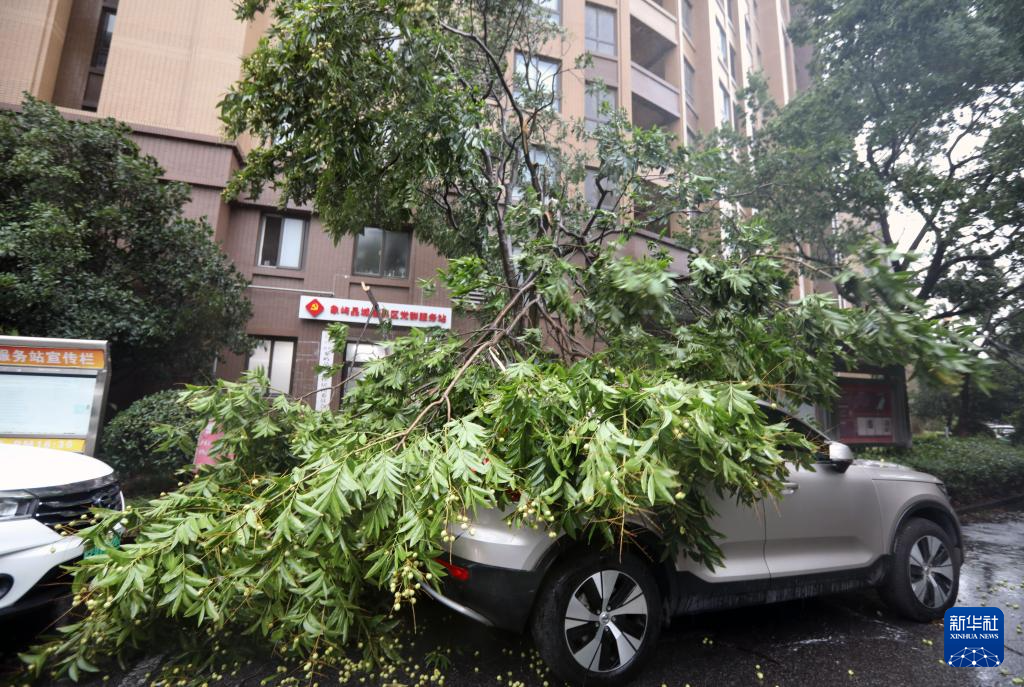 9月16日,上海一小区内树木断枝压在路边车辆上。