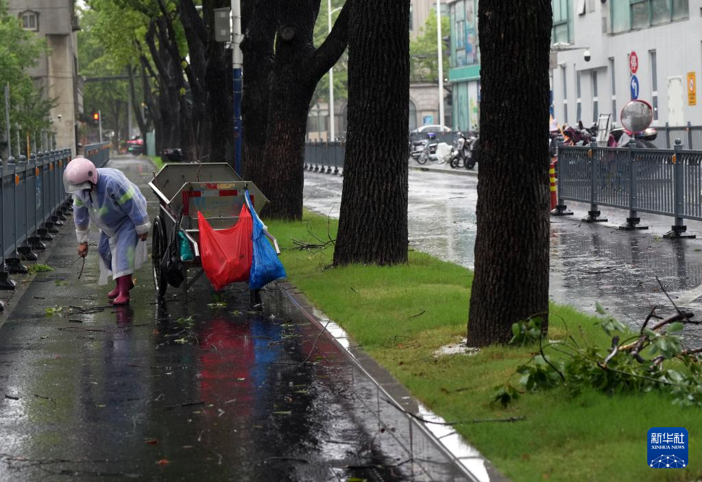 9月16日,在上海市徐汇区永嘉路上,工作人员在清理被风吹到路面上的树枝。