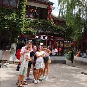 9月17日,一群外国游客在七宝古镇内游览合影。