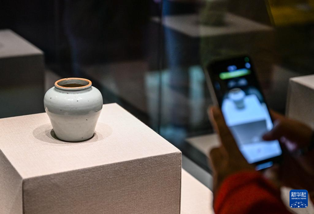 在元上都遗址旁的锡林郭勒盟文化遗产博物馆,游客拍摄展陈的元代瓷器(9月16日摄)。