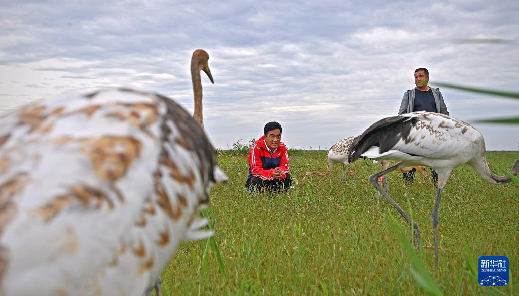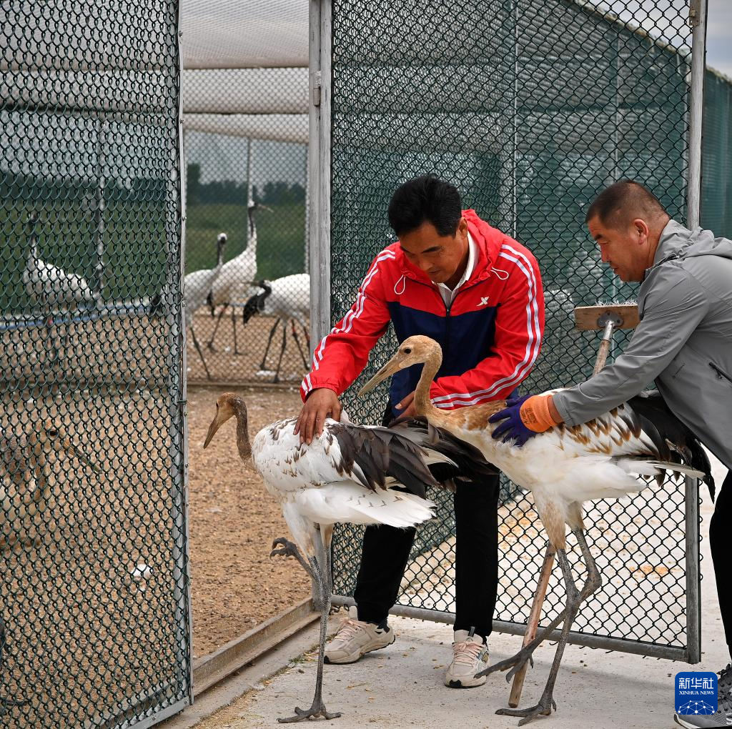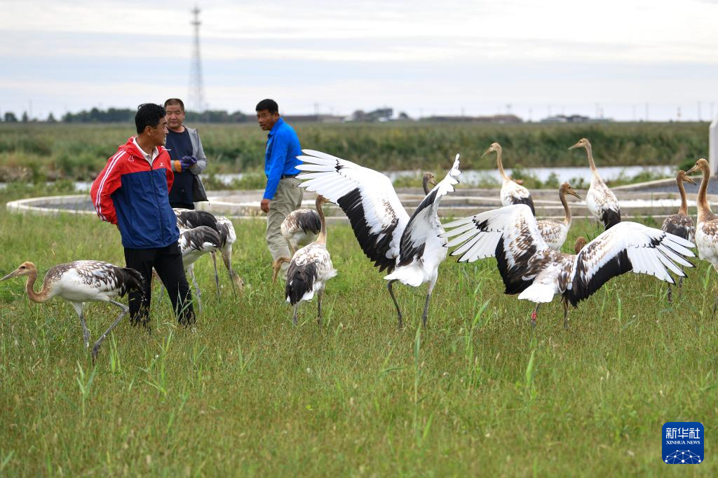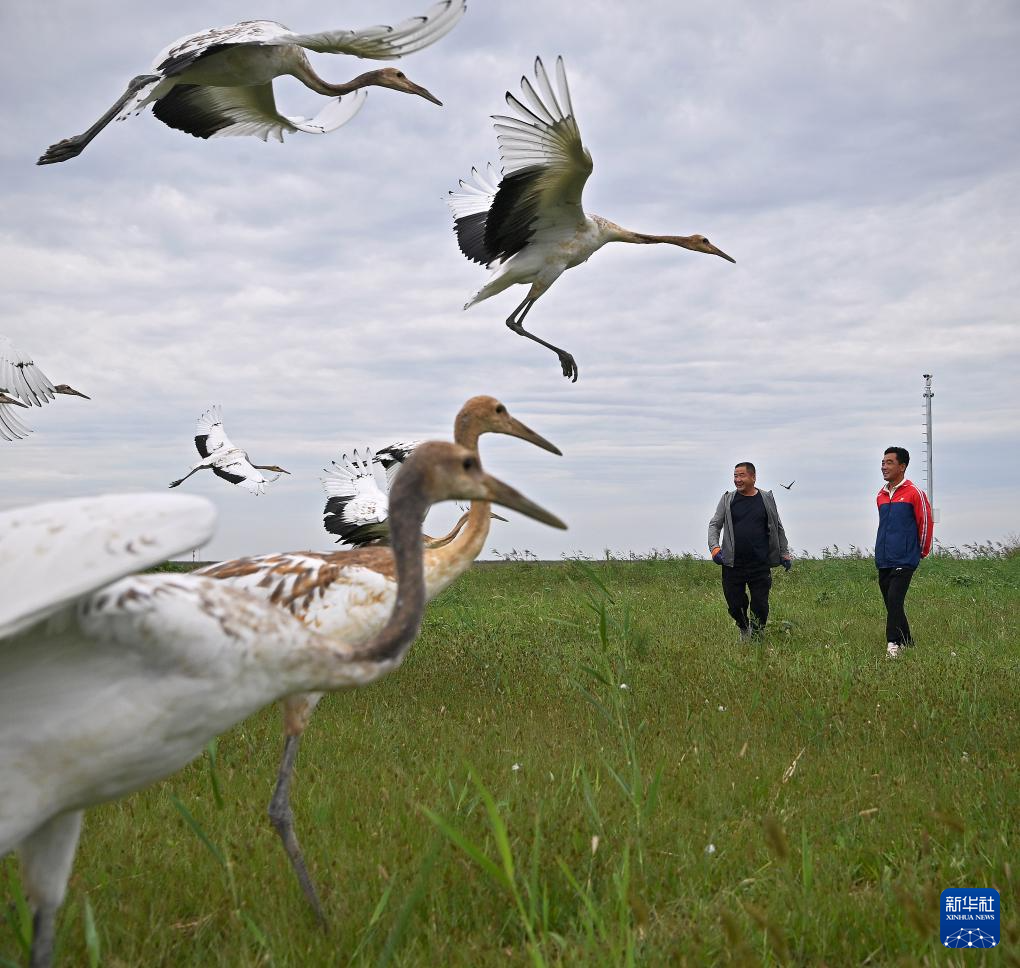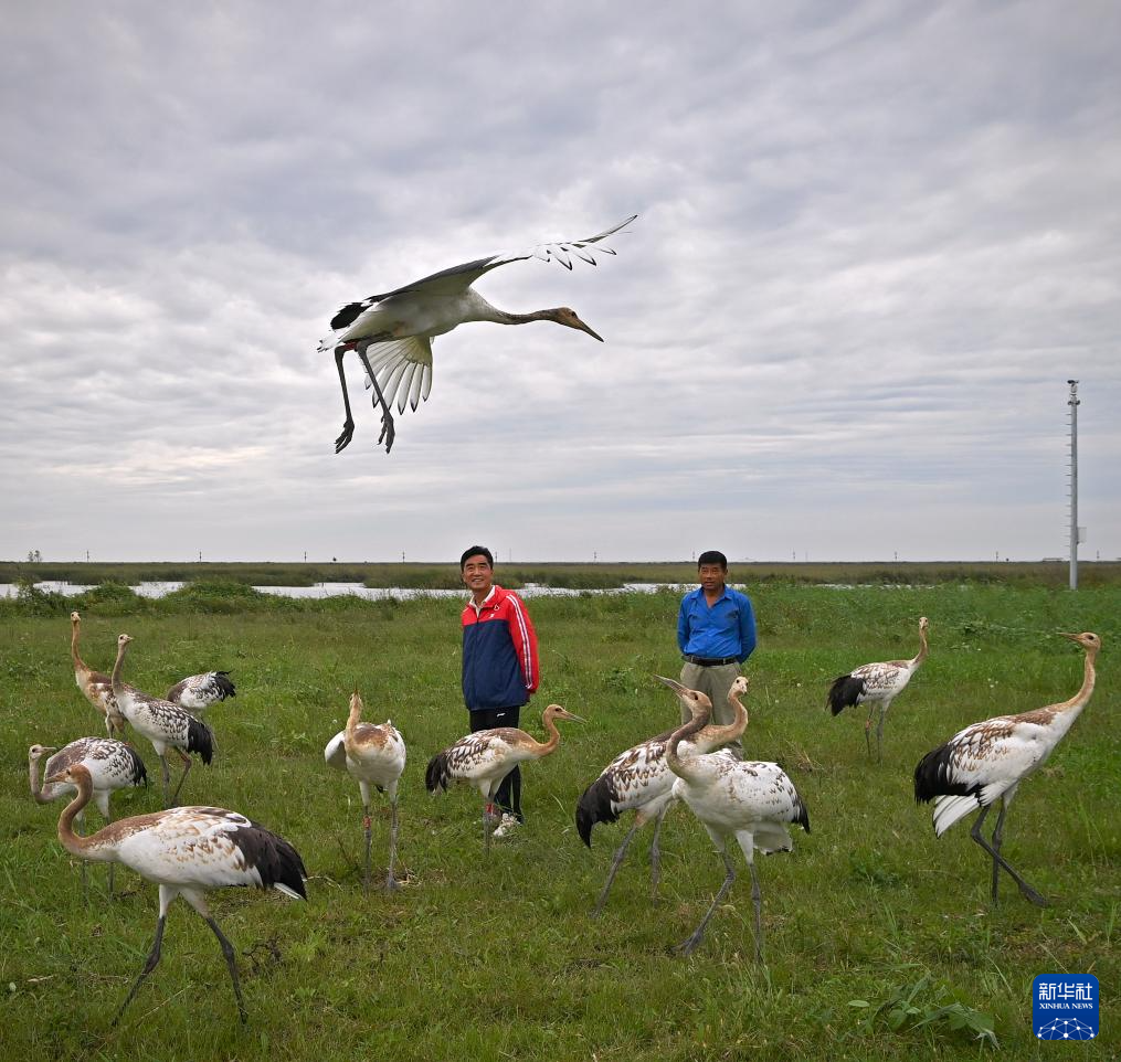9月11日,在辽河口国家级自然保护区鹤类繁育保护站野外,赵仕伟(左)和同事带领幼年丹顶鹤练习飞翔。