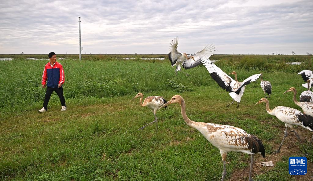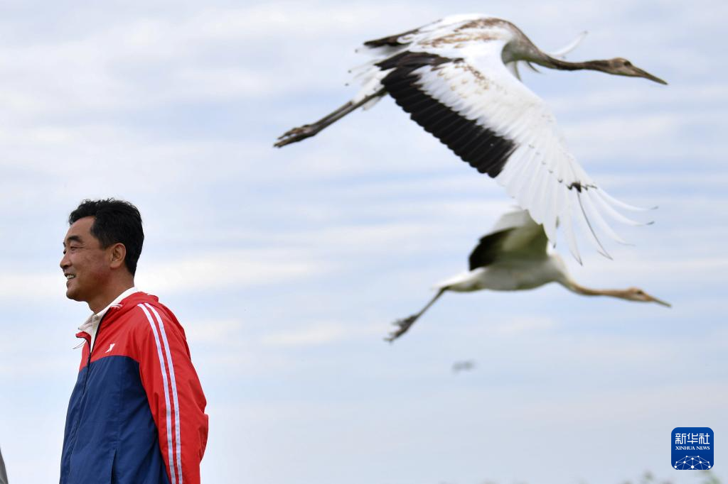 9月11日,在辽河口国家级自然保护区鹤类繁育保护站野外,赵仕伟带领幼年丹顶鹤练习飞翔。