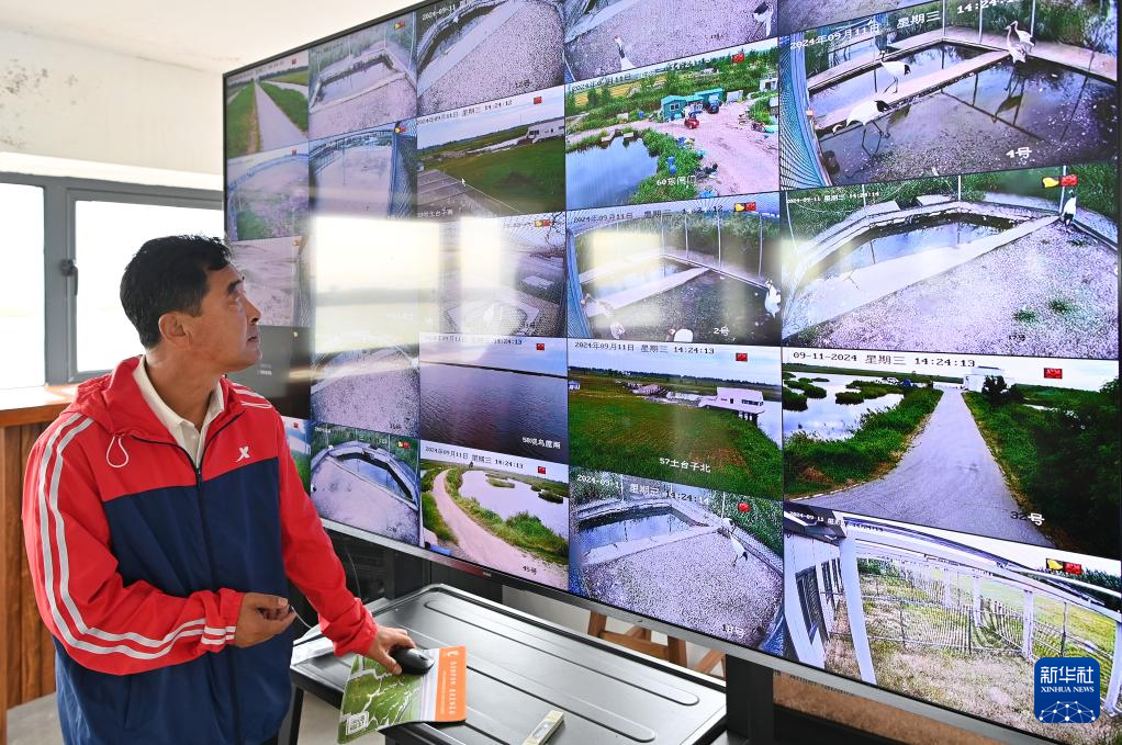 9月11日,在辽河口国家级自然保护区鹤类繁育保护站,赵仕伟调用监控查看丹顶鹤饲养情况。