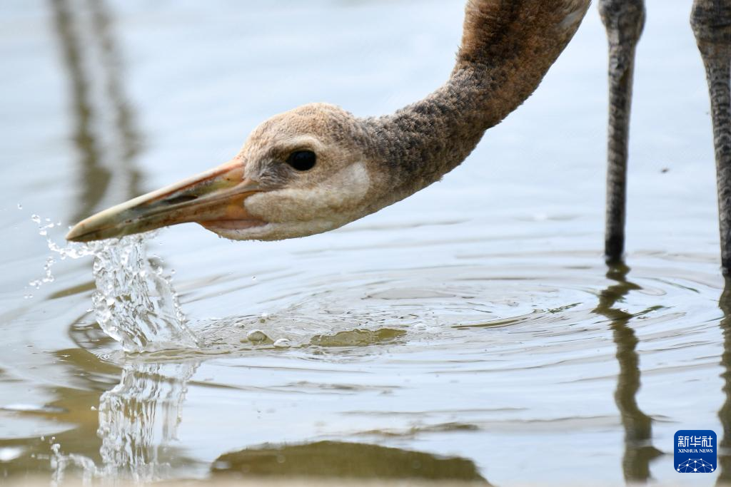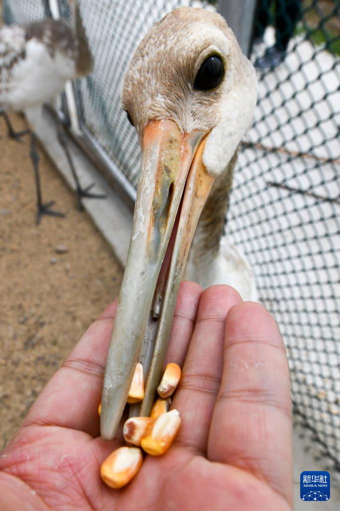 9月11日,一只幼年丹顶鹤在辽河口国家级自然保护区鹤类繁育保护站幼鹤暂养场里吃着赵仕伟喂送的玉米粒。